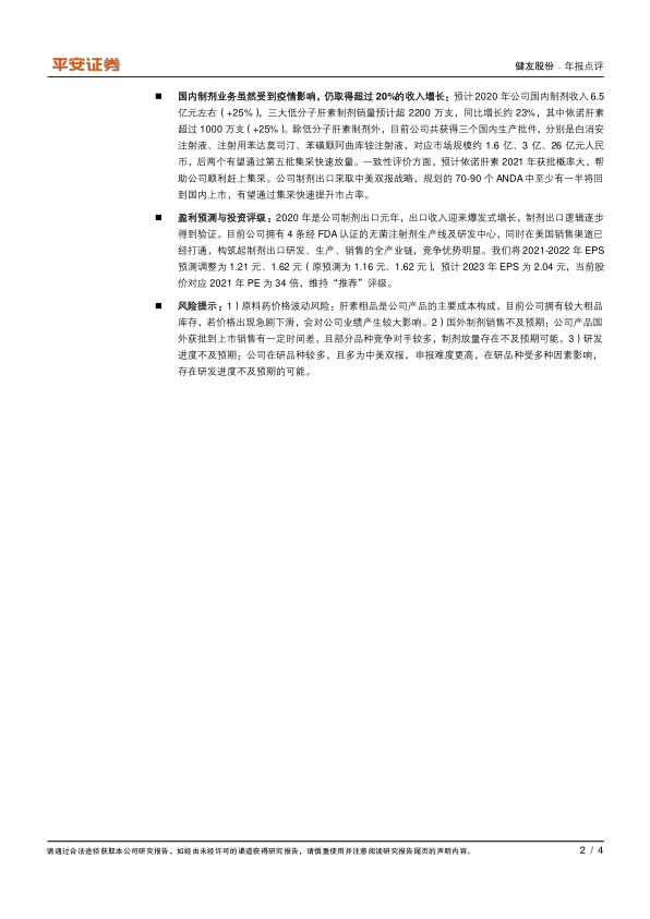 风险提示:1)原料药价格波动风险:肝素粗品是公司产品的主要成本构成,目前公司拥有较大粗品库存,若价格出现急剧下滑,会对公司业绩产生较大影响。2)国外制剂销售不及预期:公司产品国外获批到上市销售有一定时间差,且部分品种竞争对手较多,制剂放量存在不及预期可能。3)研发进度不及预期:公司在研品种较多,且多为中美双报,申报难度更高,在研品种受多种因素影响,存在研发进度不及预期的可能。