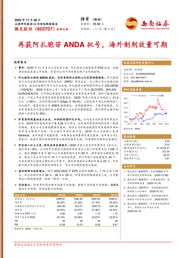 盈利预测与投资建议。预计2020-2022年EPS分别为0.87元、1.10元和1.37元,对应估值分别为46倍、36倍和29倍。肝素原料药保持高景气度,公司制剂出口将持续放量。维持“持有”评级。