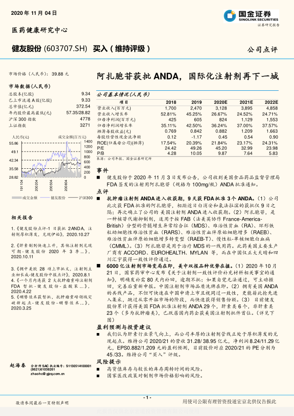 健友股份于2020年11月3日发布公告,公司收到美国食品药品监督管理局FDA签发的注射用阿扎胞苷(规格为100mg/瓶)ANDA批准通知。
