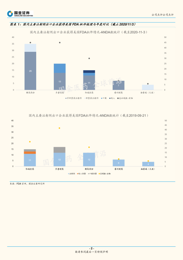 6000亿注射剂市场变局在即,美中双报品种优势在握。(1)2020年10月21日,国家药审中心发布《关于注射剂一致性评价补充材料相关事宜的通知》,明确发补需80天内补回,逾期不批;如果自觉无法通过,可主动撤回,完善后重新申报。中国注射剂市场品质洗牌在即。(2)拥有美国ANDA的共线产品,不但可快速在中国申请上市且视同过一致性,更能籍此抢先进入集采,跳过从零开拓市场的阶段,而快速获得销售份额。(3)目前健友股份累计获得美国FDA批准注射剂ANDA29个,肝素类6个,非肝素类23个(多为抗肿瘤类),已跃居国内药企获美国注射剂批件首位。