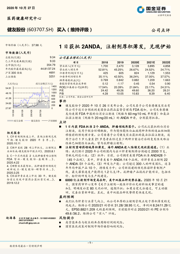 健友股份在2020年10月获得美国FDA两项抗肿瘤注射剂ANDA批准,进一步巩固了其在肿瘤治疗领域的布局。公司凭借其在肝素制剂和非肝素注射剂领域的深厚积累,拥有28个FDA批准的ANDA,且研发投入和产能扩张持续进行。面对中国6000亿注射剂市场的政策变革,公司“美中双报”的战略优势将加速兑现。分析师维持对公司未来几年营收和净利润的强劲增长预测,并给予“买入”评级,但同时提示了高库存和医改政策带来的潜在风险。总体而言,健友股份正处于业绩加速兑现期,具备较强的市场竞争力和增长潜力。