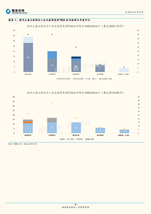注射剂重磅药领域厚积薄发,海外ANDA进入陆续兑现收获通道。(1)业绩:我们预计2020年公司的国内与出口肝素制剂将分别超过2000万支,贡献毛利近六成;(2)批件:目前,公司拥有美国FDA批准ANDA28个(45个品规),其中,肝素类6个ANDA/14个品规,非肝素类注射剂22个ANDA/31个品规。(3)研发与产能:公司超过300人的研发团队,近3年年均申报产品10个,持续发力中;公司新投建的预充依诺肝素制剂产线,最大灌装速度产能将达1.2亿支/年。抗肿瘤产品技改扩能项目,包括水针、粉针的研发与生产线建设。