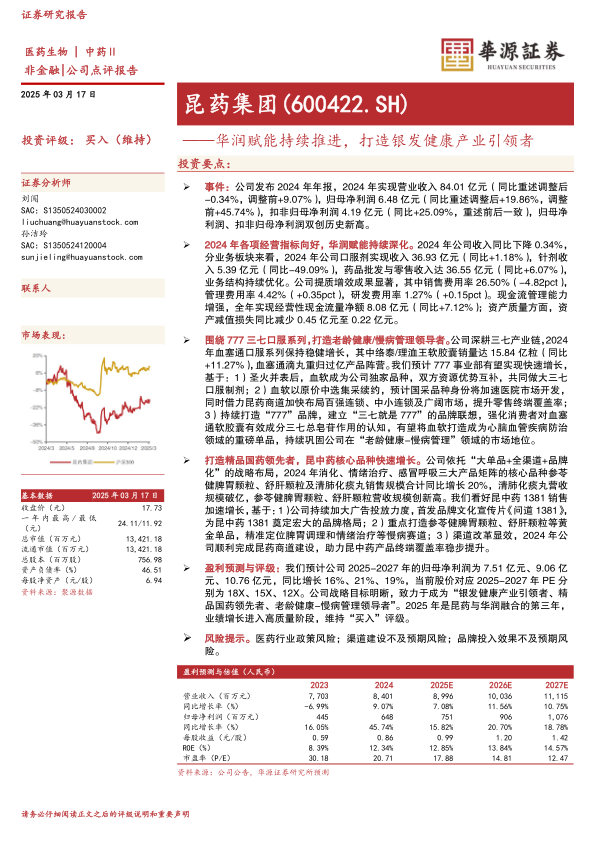 元、10.76亿元,同比增长16%、21%、19%,当前股价对应2025-2027年PE分别为18X、15X、12X。公司战略目标明晰,致力于成为“银发健康产业引领者、精品国药领先者、老龄健康-慢病管理领导者”。2025年是昆药与华润融合的第三年,业绩增长进入高质量阶段,维持“买入”评级。