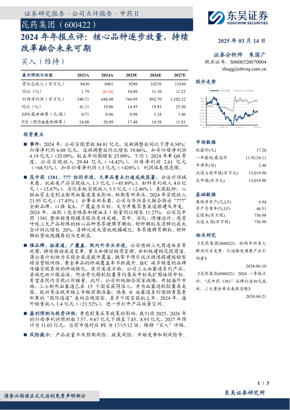 昆药集团在2024年实现了归母净利润的显著增长,追溯调整后同比增长19.86%,扣非归母净利润更是大幅增长25.09%,显示出公司强大的盈利能力和经营效率的提升。这主要得益于核心品种的逐步放量,特别是昆中药1381和777两大品牌的协同并进,以及大单品战略的成功实施。