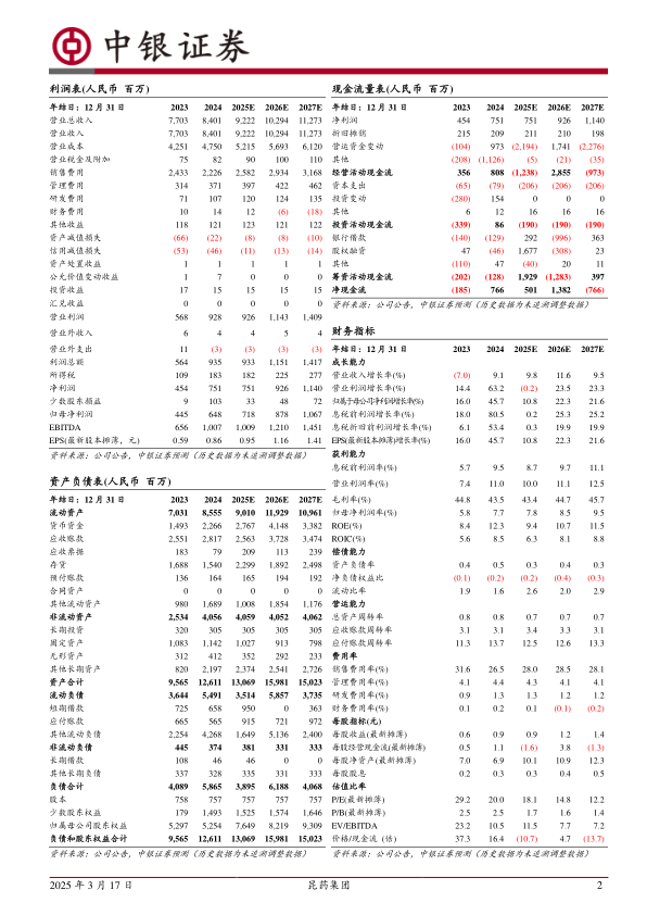 渠道整合逐步完成,提质增效值得期待。公司昆中药“大单品+全渠道+品牌化”的战略持续推进,公司借助三九商道的资源,对商业渠道进一步深入整合,目前已经基本完成全国零售、医疗体系渠道的整合建设,提质增效有望持续推进。研发方面,公司24年研发投入1.43亿元,同时采用“自主研发+投资并购+合作研发+引进代理”的模式,建立覆盖心脑血管、骨骼肌肉等核心老龄健康-慢病领域的创新研发管线,未来值得期待。