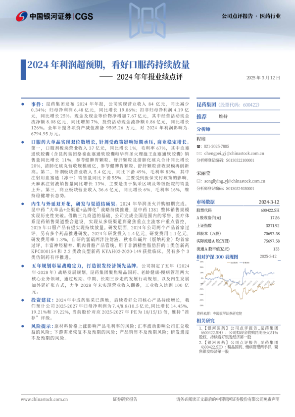 事件:昆药集团发布2024年年报,公司实现营业收入84亿元,同比减少0.34%;归母净利润6.48亿元,同比增长19.86%;扣非归母净利润4.19亿元,同比增长25%。现金及现金等价物净增加7.67亿元,其中经营活动现金流净额8.08亿元,同比增加7%,投资活动现金流净额0.86亿元,同比增长126%。全年计提各项资产减值准备9505.26万元,对2024年利润影响为-6794.95万元。