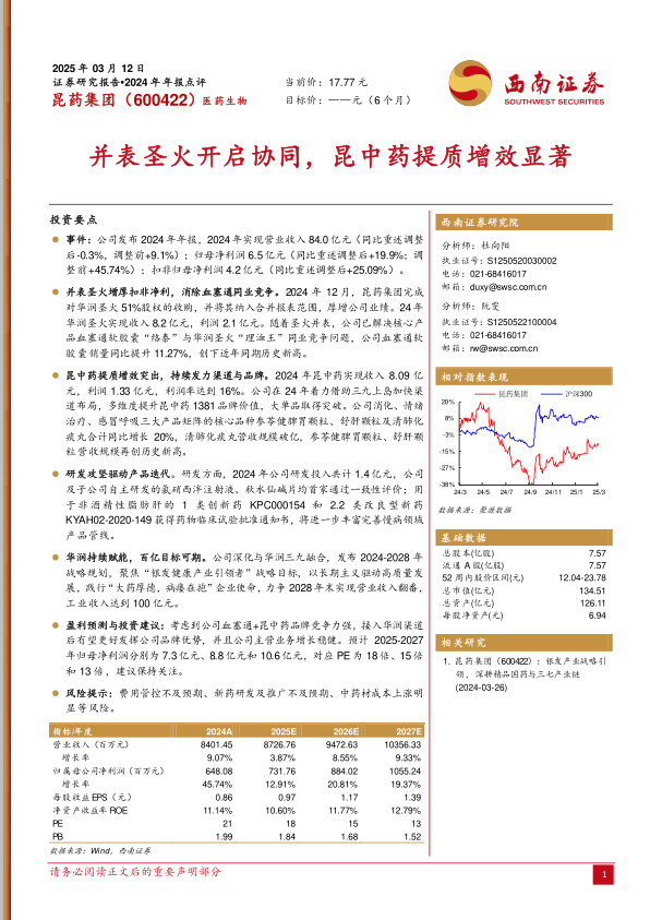 昆药集团2024年通过并表华润圣火,解决了同业竞争问题,增厚了公司业绩。昆中药业务提质增效显著,核心产品矩阵实现稳健增长。公司制定了清晰的战略规划,并与华润三九深度融合,为未来发展奠定了坚实基础。预计公司未来业绩将保持稳健增长,建议投资者保持关注。