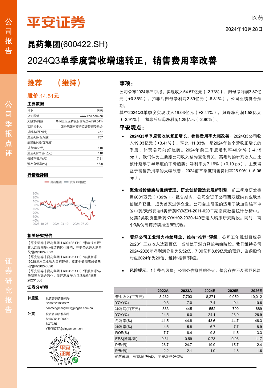 本报告对昆药集团2024年第三季度业绩进行了分析,认为公司营收恢复增长,销售费用率改善,研发创新取得进展。维持公司2024-2026年盈利预测不变,维持“推荐”评级。同时,报告也提示了整合风险、集采风险和品牌建设不及预期风险。