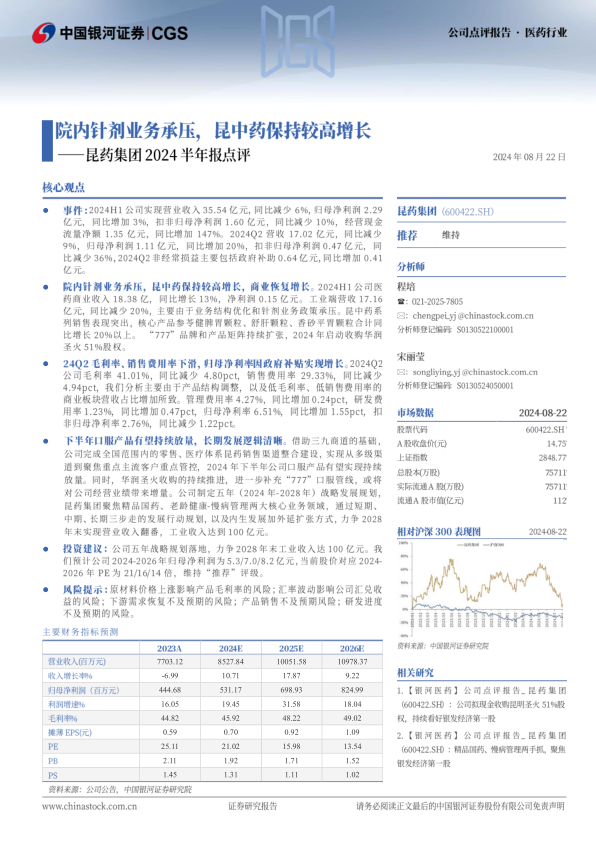 昆药集团2024半年报点评:院内针剂业务承压,昆中药保持较高增长
