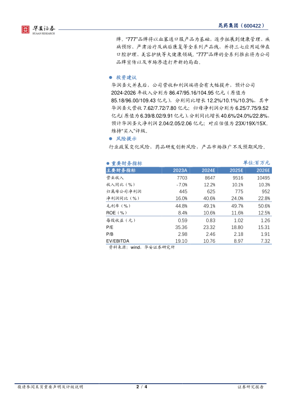 华润圣火并表后,公司营收和利润端将会有大幅提升,预计公司2024-2026年收入分别为86.47/95.16/104.95亿元(原值为85.18/96.00/109.43亿元),分别同比增长12.2%/10.1%/10.3%,其中华润圣火营收7.62/7.72/7.80亿元;归母净利润分别为6.25/7.75/9.52亿元(原值为6.39/8.02/9.91亿元),分别同比增长40.6%/24.0%/22.8%,预计华润圣火净利润2.04/2.05/2.06亿元;对应估值为23X/19X/15X。维持“买入”评级。