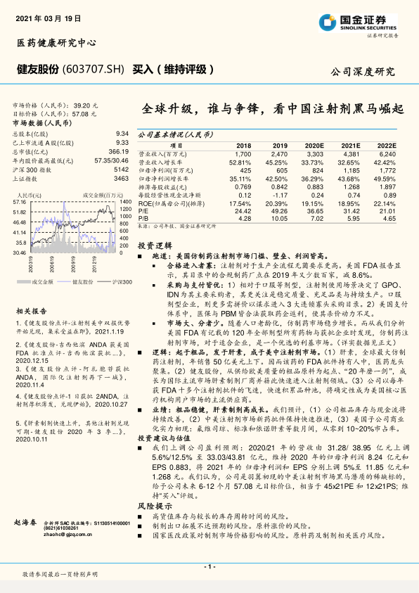 我们上调公司盈利预测:2020/21年的营收由31.28/38.95亿元上调5.6%/12.5%至33.03/43.81亿元,维持2020年的归母净利润8.24亿元和EPS0.883,将2021年的归母净利润和EPS分别上调5%至11.85亿元和1.268元。我们认为,公司是羽翼初现的中美注射剂市场黑马潜质的稀缺标的,给予公司未来6-12个月57.08元目标价位,相当于45x21PE和12x21PS;维持―买入‖评级。