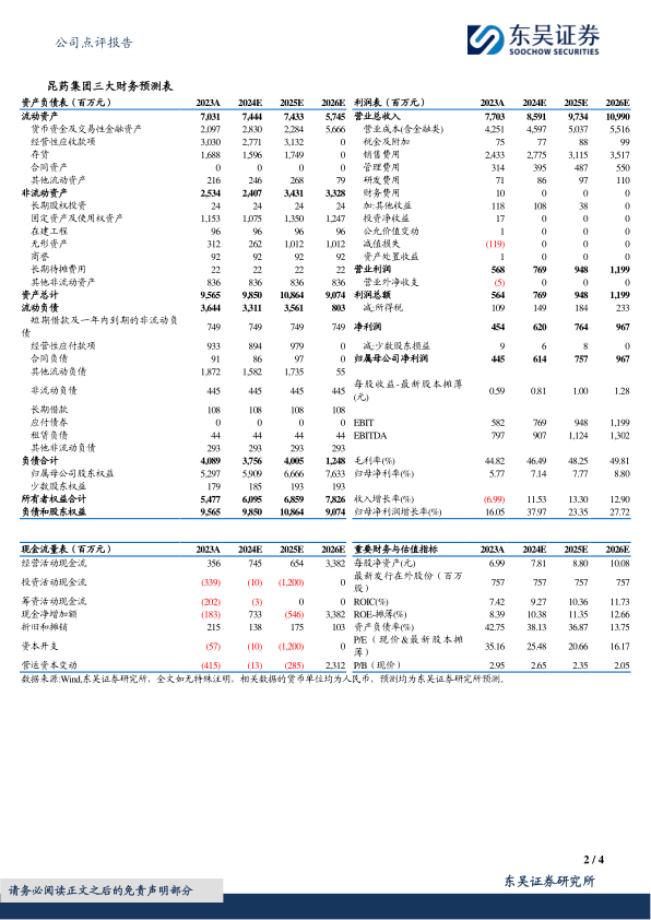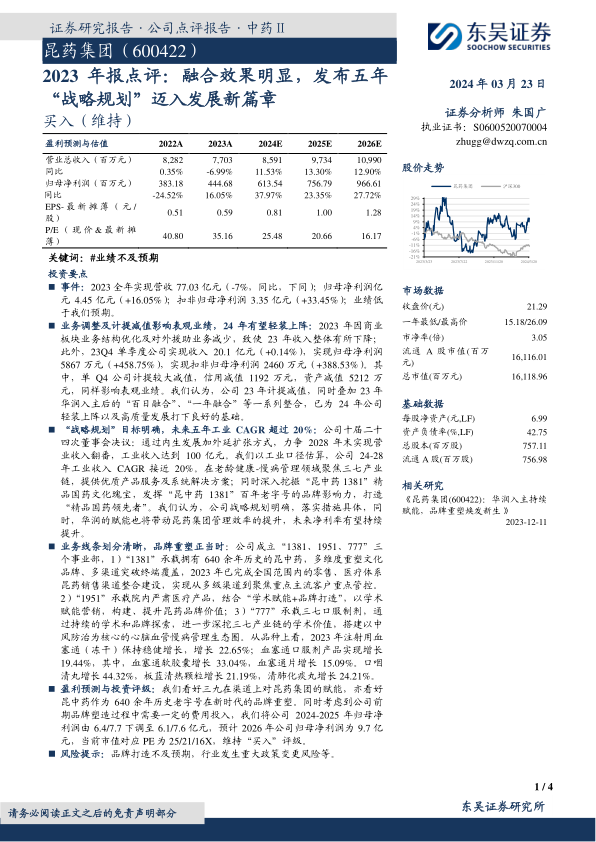 在估值方面,根据最新的盈利预测,当前市值对应昆药集团2024年、2025年和2026年的市盈率(P/E)分别为25倍、21倍和16倍。随着盈利的持续增长,市盈率呈现逐年下降的趋势,表明公司的估值吸引力将逐步提升。分析师维持了对昆药集团的“买入”评级,这反映了其对公司未来发展的积极展望。