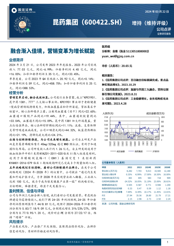 公司与华润三九融合渐入佳境,我们看好公司发展前景。考虑到品牌建设仍需持续投入,我们下调24-25年利润预测,24-25年归母净利润原预测值为7.44/8.81亿元,现预计2024-2026年归母净利润分别为5.83/7.18/9.09亿元,分别同比增长31%/23%/27%,EPS分别为0.77/0.95/1.20元,现价对应PE分别为27/22/17倍,维持“增持”评级。