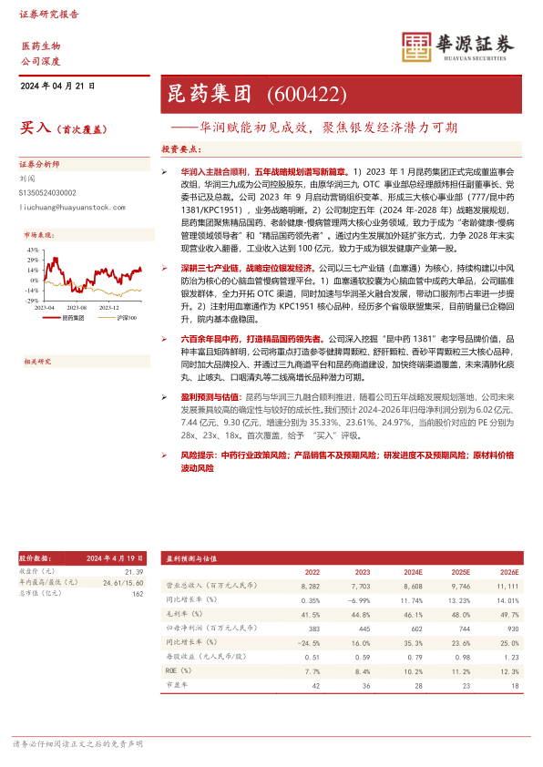 盈利预测与估值:昆药与华润三九融合顺利推进,随着公司五年战略发展规划落地,公司未来发展兼具较高的确定性与较好的成长性。我们预计2024-2026年归母净利润分别为6.02亿元、7.44亿元、9.30亿元,增速分别为35.33%、23.61%、24.97%,当前股价对应的PE分别为28x、23x、18x。首次覆盖,给予“买入”评级。