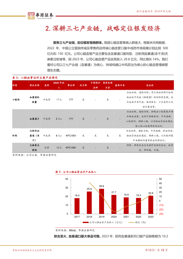 深耕三七产业链,战略定位银发经济。公司以三七产业链(血塞通)为核心,持续构建以中风防治为核心的心脑血管慢病管理平台。1)血塞通软胶囊为心脑血管中成药大单品,公司瞄准银发群体,全力开拓OTC渠道,同时加速与华润圣火融合发展,带动口服剂市占率进一步提升。2)注射用血塞通作为KPC1951核心品种,经历多个省级联盟集采,目前销量已企稳回升,院内基本盘稳固。
