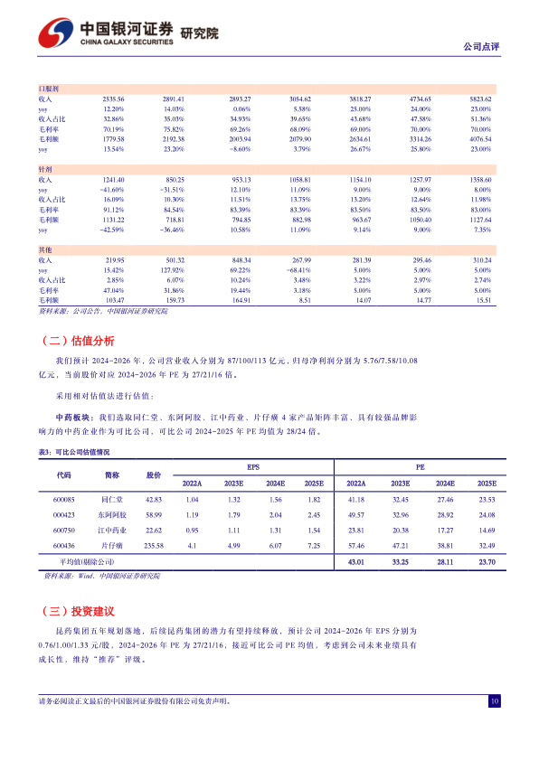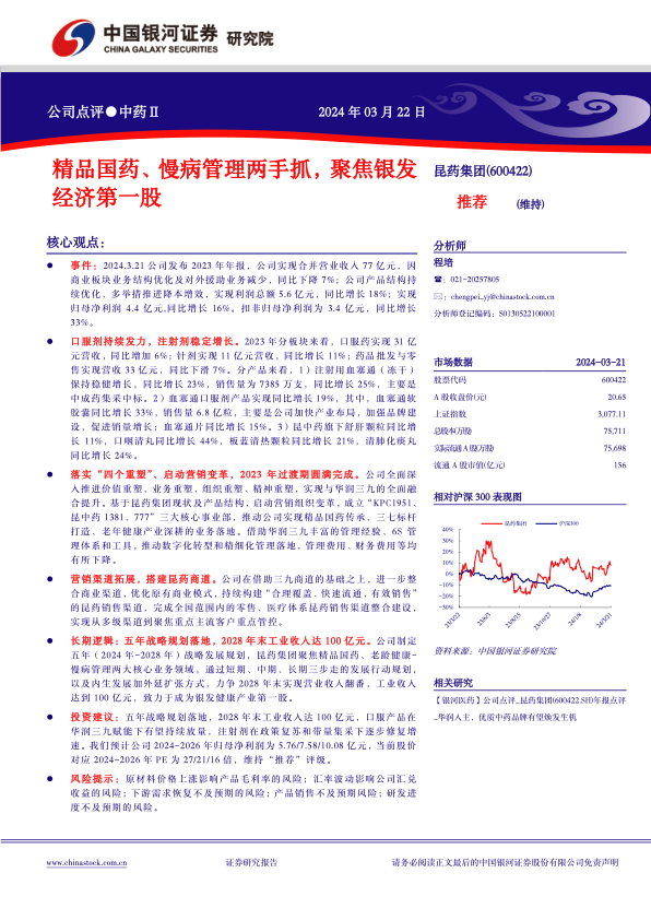 公司在华润三九的赋能下,全面深入推进“价值重塑、业务重塑、组织重塑、精神重塑”的“四个重塑”战略,并启动营销组织变革,成立“KPC1951、昆中药1381、777”三大核心事业部,旨在传承精品国药、打造三七标杆、深耕老年健康产业。公司已制定五年(2024-2028年)战略发展规划,明确聚焦精品国药和老龄健康-慢病管理两大核心业务领域,力争到2028年末实现营业收入翻番,工业收入达到100亿元,致力于成为银发健康产业的“第一股”。基于此,分析师维持“推荐”评级,并预计公司未来三年归母净利润将持续高速增长,展现出良好的成长潜力。