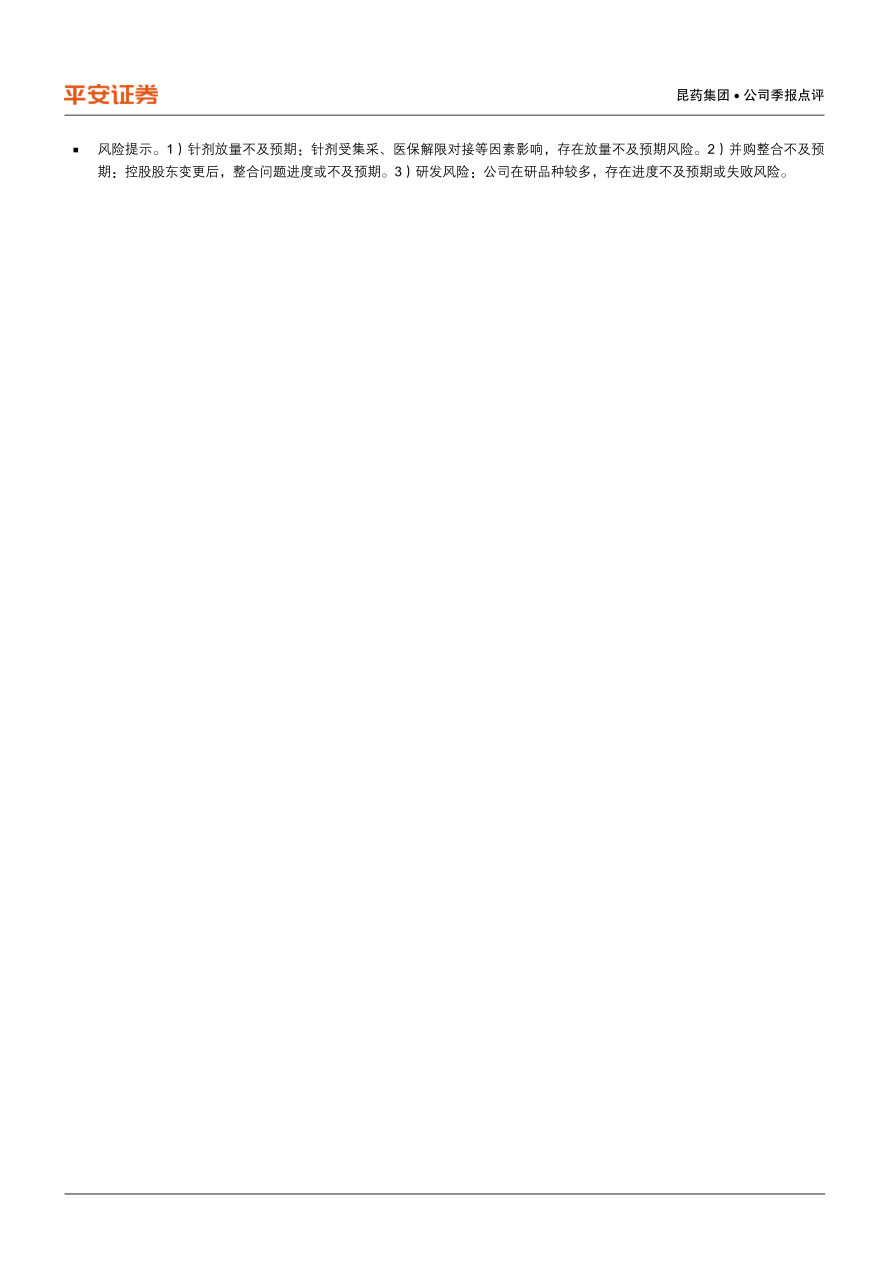 风险提示。1)针剂放量不及预期:针剂受集采、医保解限对接等因素影响,存在放量不及预期风险。2)并购整合不及预期:控股股东变更后,整合问题进度或不及预期。3)研发风险:公司在研品种较多,存在进度不及预期或失败风险。