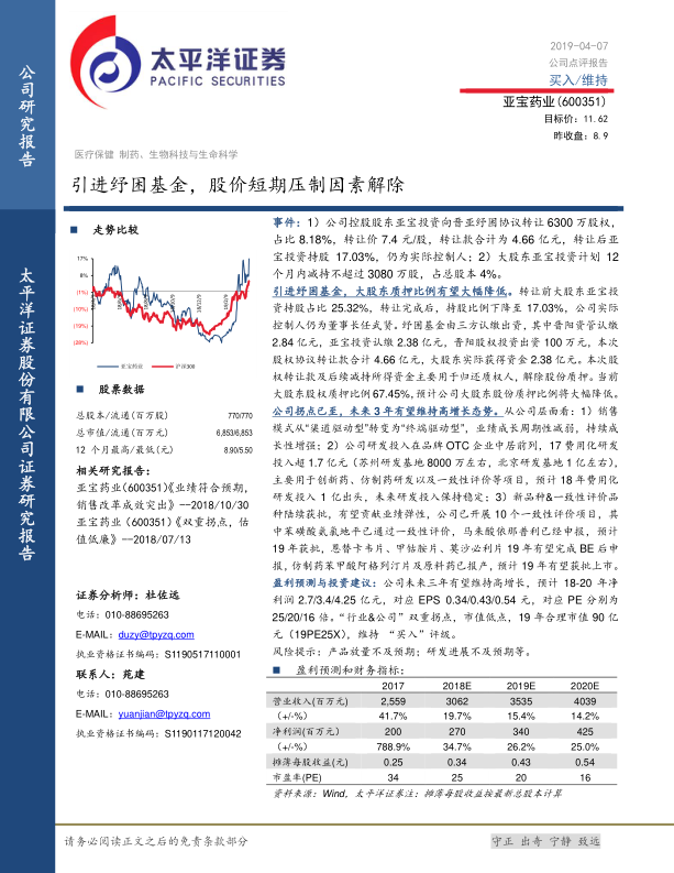 本报告分析了亚宝药业引入纾困基金后,大股东股权质押比例有望大幅降低,以及公司销售模式转变、研发投入增加和新品种获批带来的增长潜力。通过详细的盈利预测,维持了对亚宝药业的“买入”评级,并提示了相关风险。
