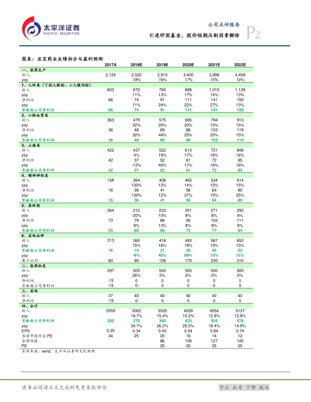 对亚宝药业的各项业务收入进行了详细的拆分与盈利预测,包括儿科类、心脑血管类、止痛类、精神神经类、原料药和其他品种等。
