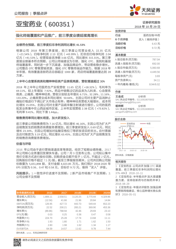 亚宝药业2018年前三季度业绩表现良好,得益于其终端覆盖和产品推广战略的有效实施。心血管和精神神经类产品成为增长亮点,公司通过调整产品价格和加大研发投入,进一步巩固市场地位。维持“买入”评级,但需关注一致性评价、新产品推广以及业绩不及预期的风险。