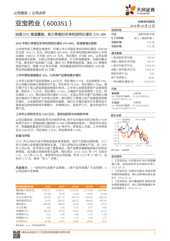 亚宝药业凭借其在OTC渠道的深耕和核心产品的市场优势,2018年前三季度业绩预计将实现显著增长。公司在儿科、心血管等领域的产品表现良好,研发投入持续增加,创新药和仿制药并举。维持对亚宝药业“买入”的投资评级,但同时也需关注一致性评价进度、新产品推广以及公司业绩等方面的风险。