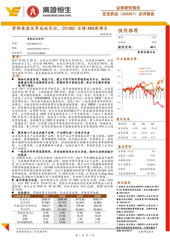 亚宝药业凭借其精细化的营销渠道改革和渠道下沉策略,在2017年及2018年第一季度实现了营收和净利润的强劲增长,特别是归母净利润同比增速分别高达788.94%和47.81%。公司通过建立可控可视的营销系统,强化终端覆盖,并深化与各类药店的合作,有效提升了市场渗透率。同时,公司聚焦核心产品和战略产品群,不断优化产品结构,并通过快速推进仿制药一致性评价和多项创新药研发项目,以及积极拓展国际市场,构建了多元化的增长引擎。分析师预计公司未来业绩有望持续30%以上增长,并给予“强烈推荐”评级,目标价10.9元/股。尽管存在营销改革不达预期、行业政策风险和市场竞争加剧等潜在风险,但公司在战略转型和创新驱动方面的努力,为其长期发展奠定了坚实基础。
