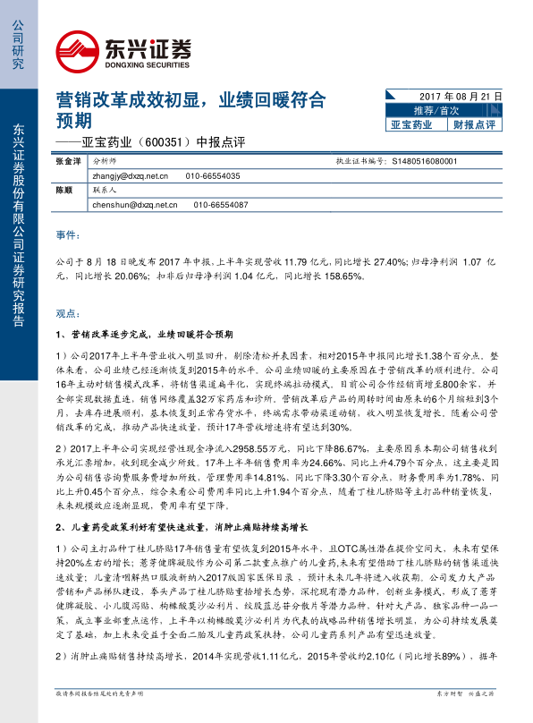 东兴证券对亚宝药业(600351)的研究报告指出,公司通过营销改革,特别是销售渠道扁平化和终端拉动模式的实施,业绩已逐渐恢复至2015年水平。预计2017年营收增速有望达到30%。