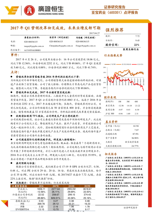亚宝药业在2016年经历了营销改革和控货策略带来的业绩下滑,但2017年Q1的业绩表现显示出反转的潜力。公司通过收购清松制药、加大研发投入和推进国际化战略,为未来的发展奠定了坚实基础。报告给予公司“强烈推荐”评级,认为其未来业绩具有成长性,值得投资者关注。