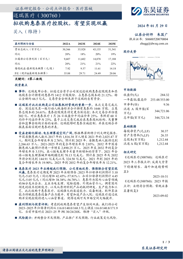 此次并购预计将产生显著的协同效应。迈瑞医疗凭借其强大的渠道能力、设备制造和软件算法优势,将赋能惠泰医疗提升设备产品力并加速产品入院。同时,惠泰医疗作为国内心血管领域的细分龙头,其在电生理、冠脉通路和外周血管介入方面的领先技术和耗材研发生产能力,将丰富迈瑞医疗的产品组合,使其进入高增长的心血管赛道。基于此,分析师上调了迈瑞医疗的盈利预测,并维持“买入”评级,预期公司未来业绩将持续稳健增长。