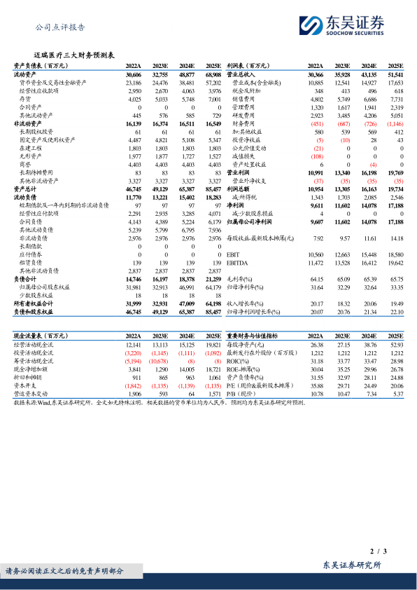 迈瑞医疗三大财务预测表(百万元)