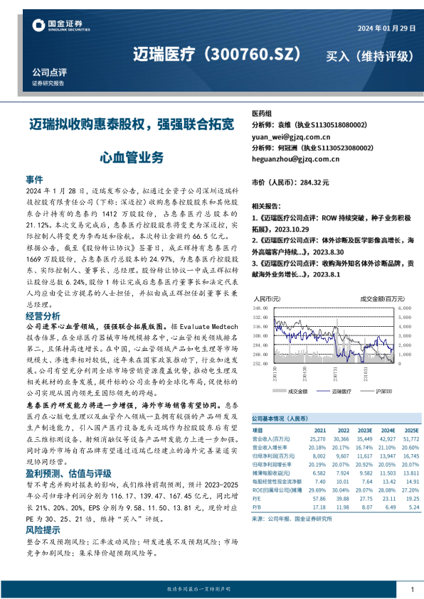 迈瑞拟收购惠泰股权,强强联合拓宽心血管业务