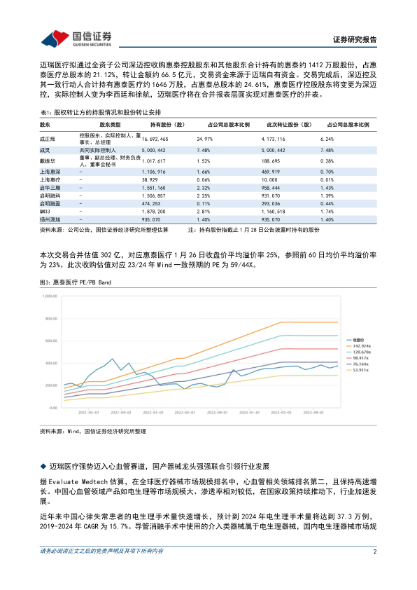 国信医药观点:此次控股权并购有望实现“1+1>2”的协同效应。对于惠泰医疗而言,有望借助于迈瑞在研发和营销体系等各方面优势,不断提升产品在全球市场的竞争力,拉动电生理、冠脉通路及外周血管介入产品的全球销售。对于迈瑞医疗而言,惠泰医疗将为其扩充新的心血管业务线,新增300亿美金的全球可及市场和250亿人民币的国内可及市场,对于帮助迈瑞实现长期业绩的快速增长有着重要意义。迈瑞医疗作为国产医疗器械领袖,研发和销售实力强劲,国际化布局成果显著,此次对于惠泰的控股权并购为其打开广阔的心血管器械赛道,助力成长为全球医械龙头,维持“买入”评级。