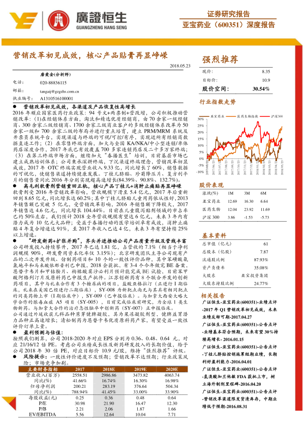 根据对公司各项业务的盈利预测,预计亚宝药业2018-2020年对应EPS分别为0.36元、0.48元、0.64元,对应PE分别为21倍、16倍、12倍。考虑到公司业绩成长性及新药研发投入的长期价值,报告给予公司2018年30倍PE,对应目标价10.9元/股,维持“强烈推荐”评级。