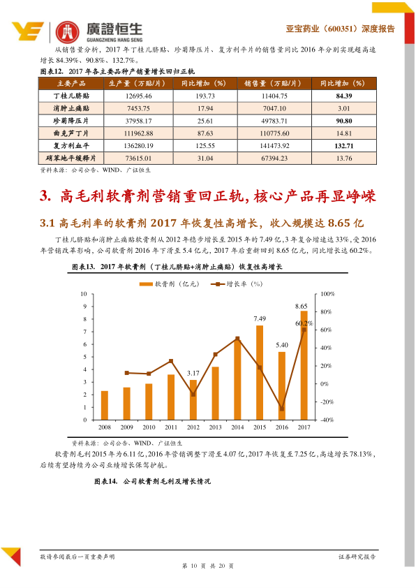 公司高毛利软膏剂业务在2017年恢复性高增长,收入规模达到8.65亿元,同比增长60.2%,毛利恢复至7.25亿元,同比增长78.13%。其中,核心产品丁桂儿脐贴作为公司独家儿童腹泻治疗品种,凭借其脐部给药的依从性优势,市场反应良好。尽管2016年受营销改革影响销售额有所下降,但2017年已恢复至4.65亿元,同比增长104.44%。目前,丁桂儿脐贴在儿童腹泻贴剂领域的市占率已达50%左右,预计2018年全年营收有望达到6亿元,未来3年内有潜力成长为10亿元大品种。另一核心产品消肿止痛贴受益于“春播行动”的医学培训,4年复合增速达91%,2017年收入已达4亿元,未来3年有望持续25%以上增速。