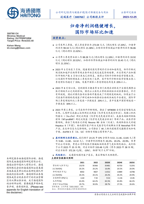 迈瑞医疗在2023年前三季度实现了营收和归母净利润的稳健增长,尤其在国际市场表现出强劲的增长势头,有效对冲了国内医疗反腐带来的短期负面影响。公司持续投入研发,在三大核心业务领域不断推出创新产品,巩固了其市场竞争力。尽管面临国内政策调整带来的挑战,但凭借其全球化战略、高端客户拓展和本地化运营,公司预计未来仍将保持良好的盈利增长。财务数据显示公司盈利能力强劲,现金流充裕,资产负债结构健康。报告维持“优于大市”评级,但提醒投资者关注国内政策风险。