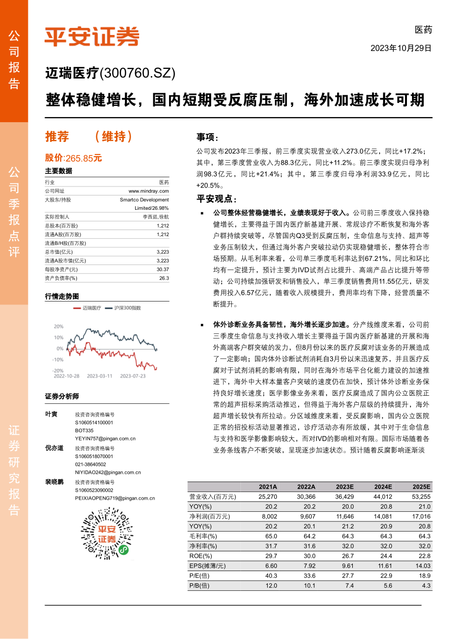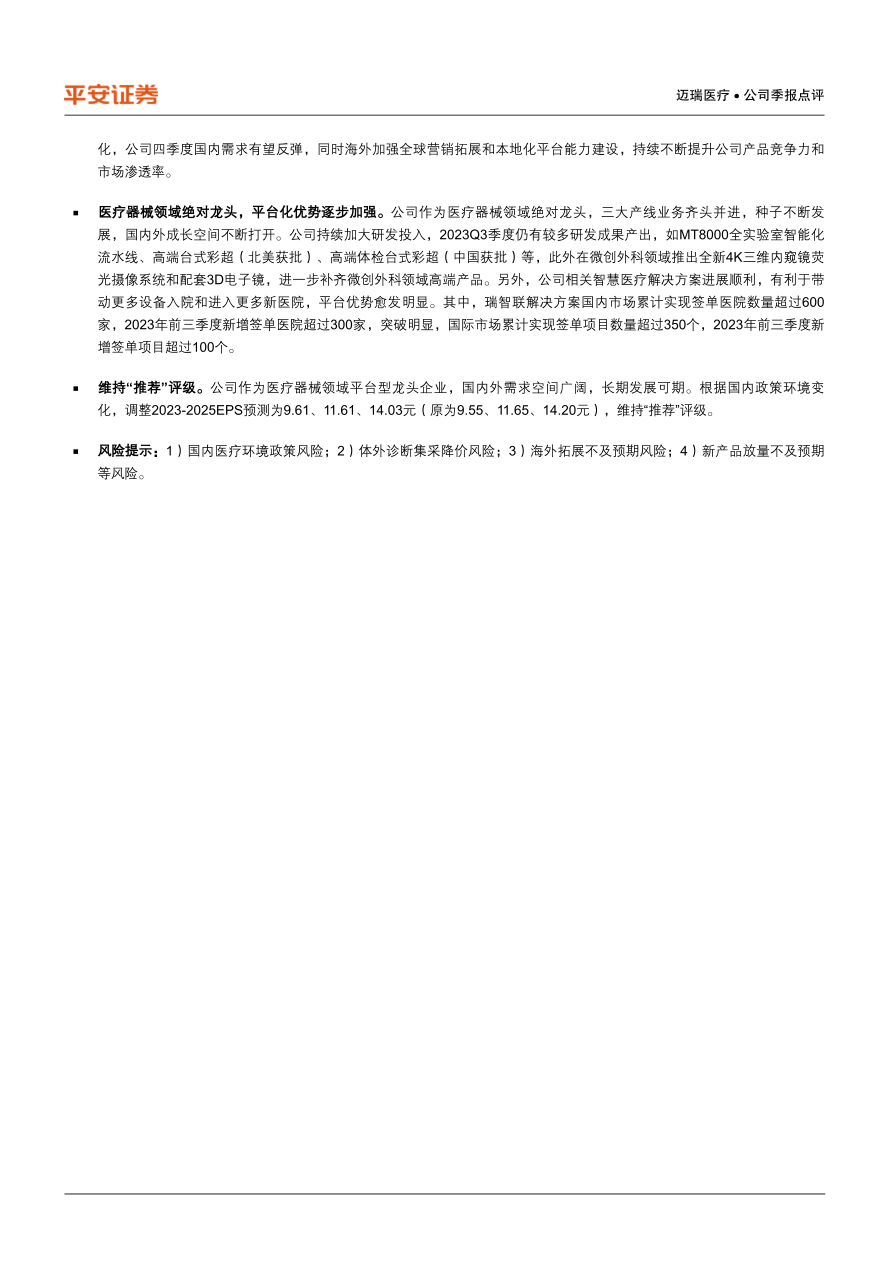 本报告分析了迈瑞医疗2023年三季报,指出公司整体经营稳健增长,业绩表现优于收入增长。虽然国内市场受到反腐影响,但海外市场加速增长,体外诊断业务表现出较强韧性。公司持续加大研发投入,平台化优势逐步加强,智慧医疗解决方案助力市场拓展。维持“推荐”评级,但需关注国内医疗政策、集采降价、海外拓展以及新产品放量等风险。