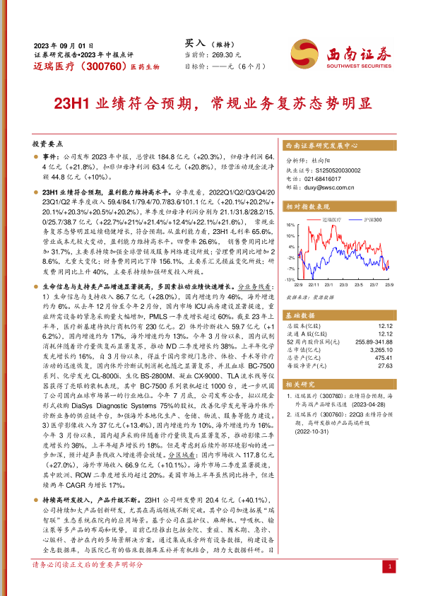 迈瑞医疗2023年上半年表现强劲,业绩符合预期,营收和净利润均实现两位数增长。公司盈利能力保持高水平,并通过持续高研发投入推动产品创新和高端化升级,尤其在生命信息与支持、体外诊断和医学影像三大核心业务线均展现出良好的增长态势。国内外市场协同发展,国内新基建和诊疗量恢复是主要驱动力,海外市场也呈现加速增长。展望未来,公司凭借其强大的研发实力和市场拓展能力,有望继续保持稳健增长,维持“买入”评级,但需关注汇率波动、政策控费及新产品研发进展等潜在风险。