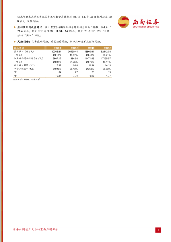 持续高研发投入,产品升级不断。 23H1 公司研发费用 20.4 亿元(+40.1%),公司持续加大产品创新研发,尤其在高端领域不断突破。 其中公司加速拓展“瑞智联”生态系统在院内的应用场景。基于公司在监护仪、麻醉机、呼吸机、输注泵等多产品的布局和优势,目前已经推出包括全院、重症、围术期、急诊、心脏科、普护在内的多场景解决方案。通过集成床旁所有设备数据,构建设备全息数据库,与医院已有的临床数据库互补并有机结合,助力大数据科研。目前瑞智联生态系统实现签单医院数量累计超过 500家(其中 23H1新增超过 200 家),发展迅猛。