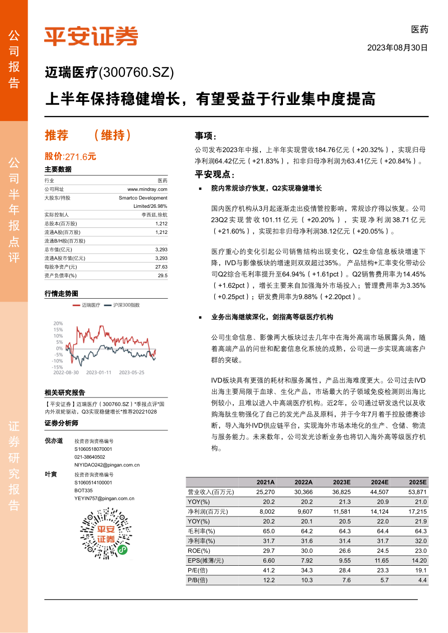 本报告分析了迈瑞医疗2023年中报,指出公司上半年保持稳健增长,受益于常规诊疗恢复和产品结构优化。同时,公司积极拓展海外市场,IVD业务出海战略逐步深化。此外,医疗器械集采和反腐政策的推进,有望加速行业集中度提高,公司作为行业龙头有望长期受益。维持“推荐”评级。