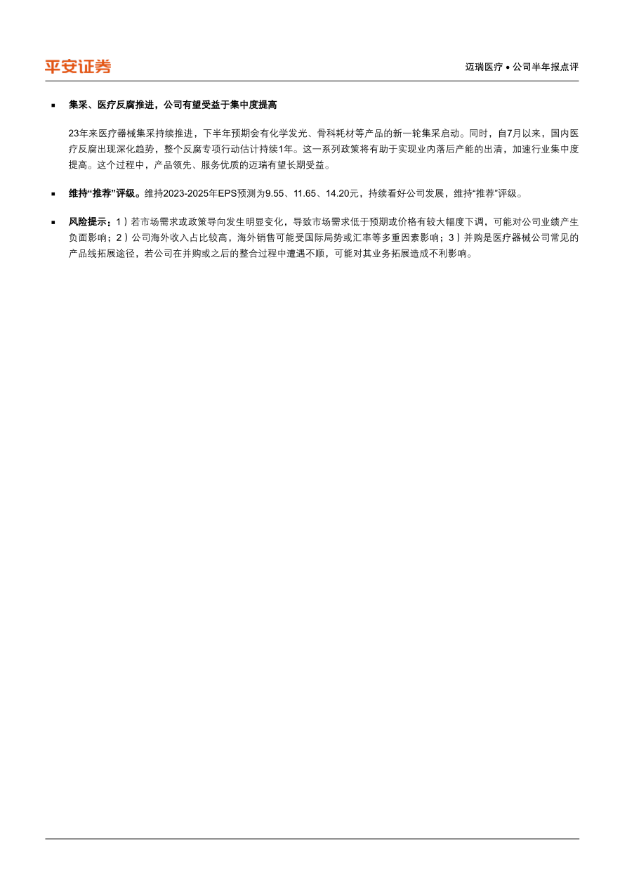 风险提示:1)若市场需求或政策导向发生明显变化,导致市场需求低于预期或价格有较大幅度下调,可能对公司业绩产生负面影响;2)公司海外收入占比较高,海外销售可能受国际局势或汇率等多重因素影响;3)并购是医疗器械公司常见的产品线拓展途径,若公司在并购或之后的整合过程中遭遇不顺,可能对其业务拓展造成不利影响。