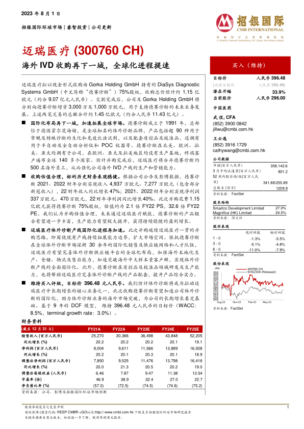 维持买入评级,目标价396.48元人民币。我们预计体外诊断将成为拉动迈瑞医疗中长期增长的核心业务之一,此次收购德赛诊断有望加速公司体外诊断的国际化,助力体外诊断业务的海外市场突破,为公司的长期增长奠定基础。基于9年的DCF模型,维持396.48元人民币的目标价(WACC:8.5%,terminalgrowthrate:3.0%)。