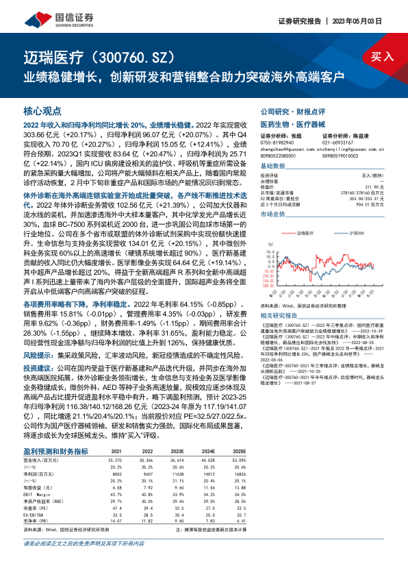 投资建议:公司在国内受益于医疗新基建和产品迭代升级,并同步在海外加快高端医院拓展。体外诊断业务领衔增长,生命信息与支持业务及医学影像业务稳健成长,微创外科、AED等种子业务高速放量,规模效应逐步体现及高端产品占比提升促进盈利水平稳中有升。略下调盈利预测,预计2023-25年归母净利润116.38/140.12/168.26亿元(2023-24年原为117.19/141.07亿),同比增速21.1%/20.4%/20.1%;当前股价对应PE=32.5/27.0/22.5x。公司作为国产医疗器械领袖,研发和销售实力强劲,国际化布局成果显著,将逐步成长为全球医械龙头,维持“买入”评级。
