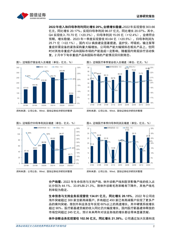 2022年收入和归母净利均同比增长20%,业绩增长稳健。2022年实现营收303.66亿元(+20.17%),归母净利润96.07亿元(+20.07%)。其中Q4实现收入70.70亿(+20.27%),归母净利润15.05亿(+12.41%),业绩符合预期。2023Q1实现营收83.64亿(+20.47%),归母净利润为25.71亿(+22.14%),国内ICU病房建设相关的监护仪、呼吸机等重症所需设备的紧急采购量大幅增加,公司将产能大幅倾斜在相关产品上,随着国内常规诊疗活动恢复,2月中下旬非重症产品和国际市场的产能情况回归到常态。