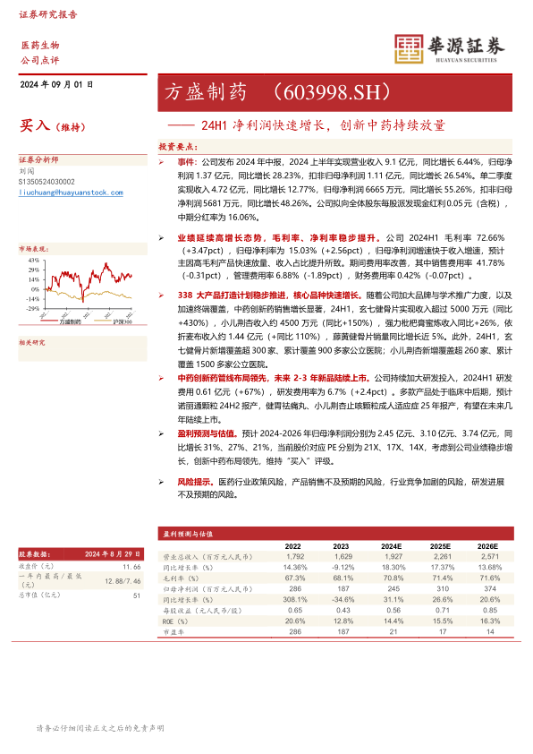 盈利预测与估值。预计2024-2026年归母净利润分别为2.45亿元、3.10亿元、3.74亿元,同比增长31%、27%、21%,当前股价对应PE分别为21X、17X、14X,考虑到公司业绩稳步增长,创新中药布局领先,维持“买入”评级。