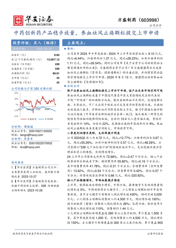 公司发布2024年半年度报告:2024年上半年实现营业收入9.10亿元,同比+6.44%;归母净利润1.37亿元,同比+28.23%;扣非归母净利润1.11亿元,同比+26.54%;同时公司发布《关于全资子公司收到药品注册受理通知书的公告》:方盛制药全资子公司广东方盛健盟药业完成养血祛风止痛颗粒(曾用名:诺丽通颗粒)的长毒试验,并向国家药品监督管理局提交上市许可申请。2024年9月13日,健盟药业收到养血祛风止痛颗粒《受理通知书》。