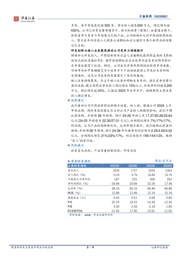 我们看好公司中药创新药品种稳步放量。收入端,根据公司2024上半年的业绩,同时考虑到集采压力对公司产品收入规模的影响,我们下调此前预测,并新增26年预测,预计24-26年收入为17.37/20.26/23.64亿元(24-25年前值为22.30/27.01亿元),分别同比增长7%/17%/17%,利润端,公司产品结构持续优化,毛利率稳步提升,我们维持此前盈利预测,并新增26年预测,预计24-26年归母净利润分别为2.25/3.00/3.52亿元,分别同比增长21%/33%/17%,对应估值为19X/14X/12X。维持“买入”投资评级。