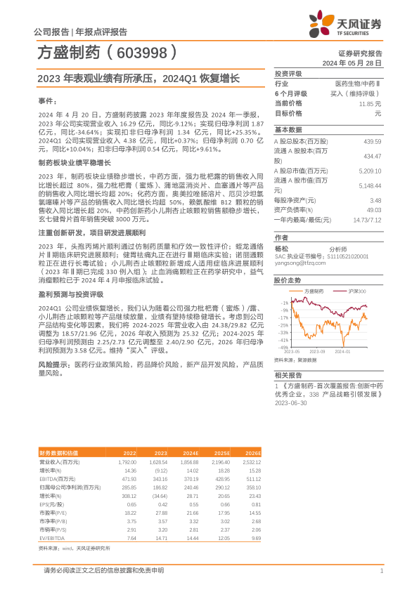 本报告分析了方盛制药2023年业绩及2024年一季度业绩,指出公司业绩在2023年有所承压,但在2024年Q1已恢复增长。公司制药板块业绩平稳增长,尤其是在中药产品方面表现突出。公司注重创新研发,多个项目进展顺利。报告调整了公司未来几年的营收和净利润预测,但维持“买入”评级。