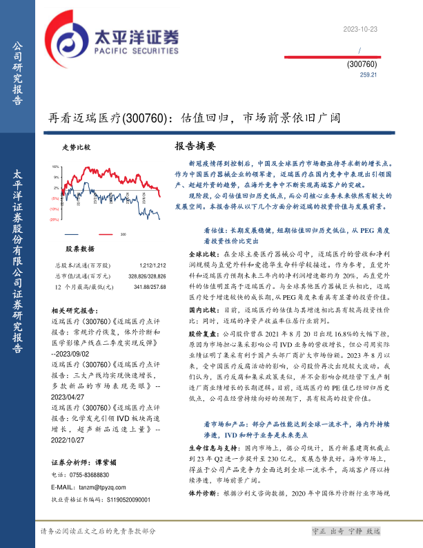 以10月23日收盘价259.21元计算,公司2023~2025年的EPS分别为9.54/11.56/13.87元/股,对应PE值分别为27.16/22.42/18.69,对应PEG分别为1.33/1.06/0.93。迈瑞医疗当下的估值,无论与全球或国内主要医疗器械企业相比,或与自身历史估值水平比较,均具有较高投资价值,维持“买入”评级。