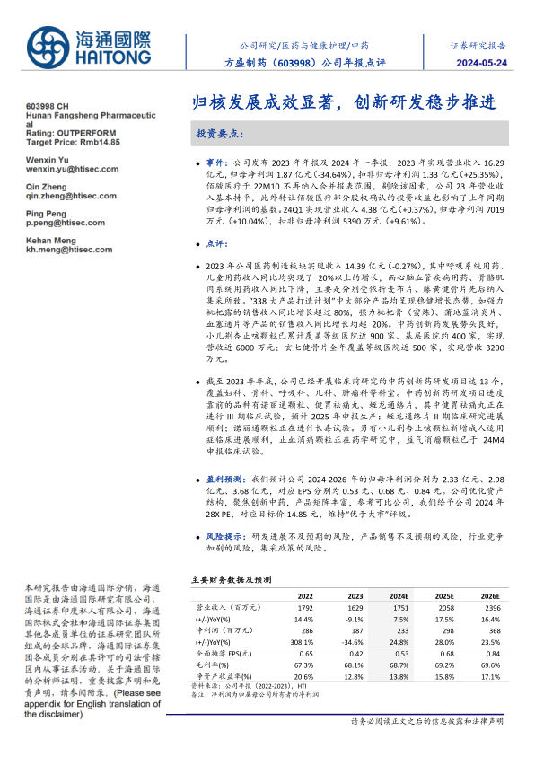 盈利预测:我们预计公司2024-2026年的归母净利润分别为2.33亿元、2.98亿元、3.68亿元,对应EPS分别为0.53元、0.68元、0.84元。公司优化资产结构,聚焦创新中药,产品矩阵丰富,参考可比公司,我们给予公司2024年28X PE,对应目标价14.85元,维持“优于大市”评级。