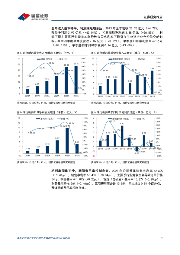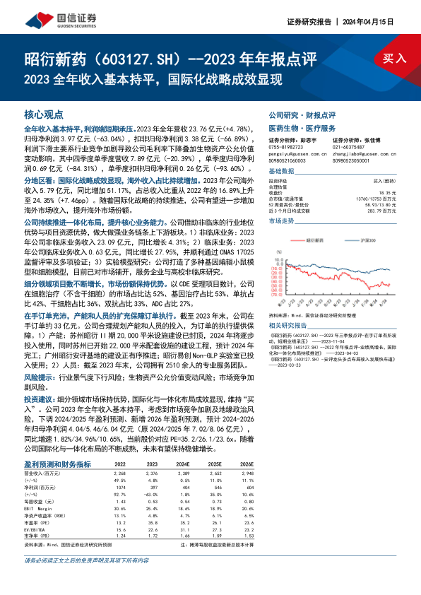 昭衍新药2023年全年营收基本持平,但受行业竞争加剧和生物资产公允价值变动影响,归母净利润大幅下滑。尽管面临短期业绩压力,公司国际化战略成效显著,海外收入实现51.17%的增长,占比提升至24.35%。同时,公司持续推进一体化业务布局,非临床、临床及实验模型研究能力不断提升,并在细胞治疗、基因治疗等多个细分领域保持市场领先地位。公司在手订单充沛,并通过产能扩建和人员扩充为未来订单执行提供保障。鉴于市场竞争和地缘政治风险,分析师下调了盈利预测,但仍维持“买入”评级,认为随着公司国际化与一体化布局的不断成熟,未来有望保持稳健增长。